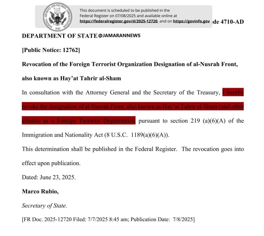 🔸وزارت امور خارجه آمریکا به طور رسمی نام جبهه النصره را از لیست گروه های تروریستی حذف کرد.