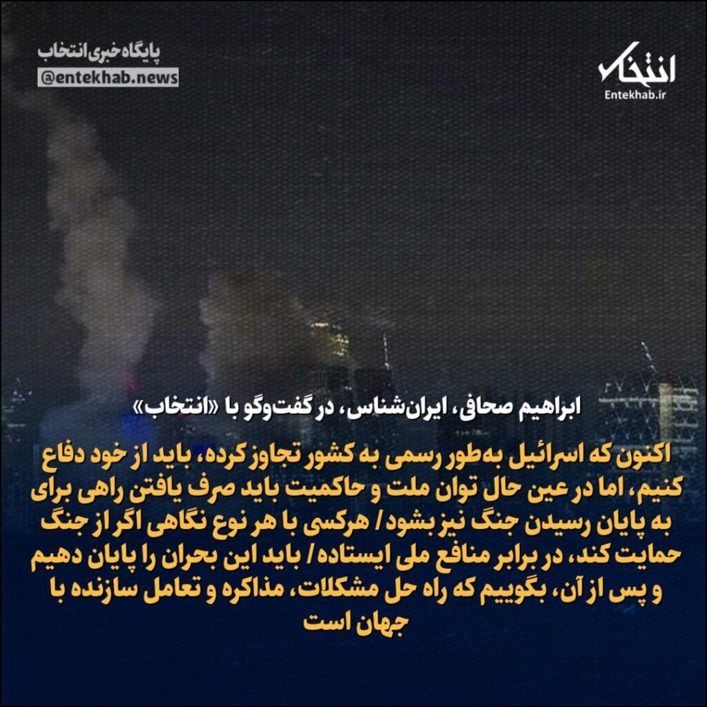 🔹 اکنون که اسرائیل به‌طور رسمی به کشور تجاوز کرده، باید از خود دفاع کنیم، اما در عین حال توان ملت و حاکمیت باید صرف یافتن راهی برای به پایان‌ رسیدن جنگ نیز بشود