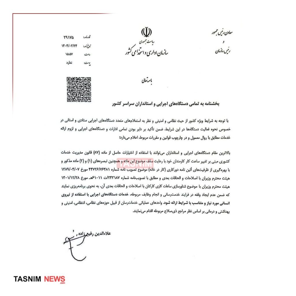 🔴سازمان اداری و استخدامی کشور در بخشنامه‌ای، اختیار اعطای دورکاری به کارکنان دولت با توجه به شرایط نظامی و امنیتی را به استاندار‌ها واگذار کرد.