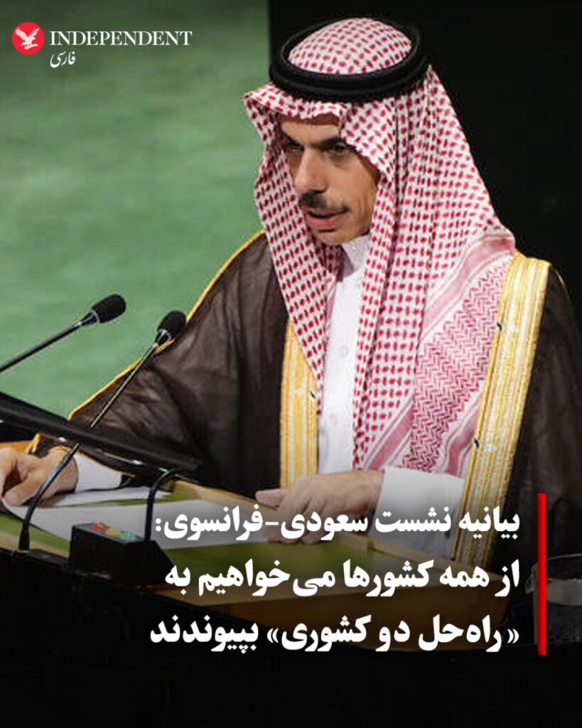 وزیر خارجه عربستان سعودی، این بیانیه را به نمایندگی از پادشاه و ولیعهد این کشور خواند و ضمن قدردانی از امانوئل مکرون، رئیسجمهوری فرانسه، بهخاطر اعلام رسمی به رسمیت شناختن کشور فلسطین، خواستار پایان فوری حملات اسرائیل در غزه، کرانه باختری و قدس شرقی شد. او تاکید کرد که تنها راه دستیابی به صلح پایدار، اجرای راهحل دو کشوری و تشکیل کشور مستقل فلسطین در مرزهای ۱۹۶۷ با پایتختی قدس شرقی است.