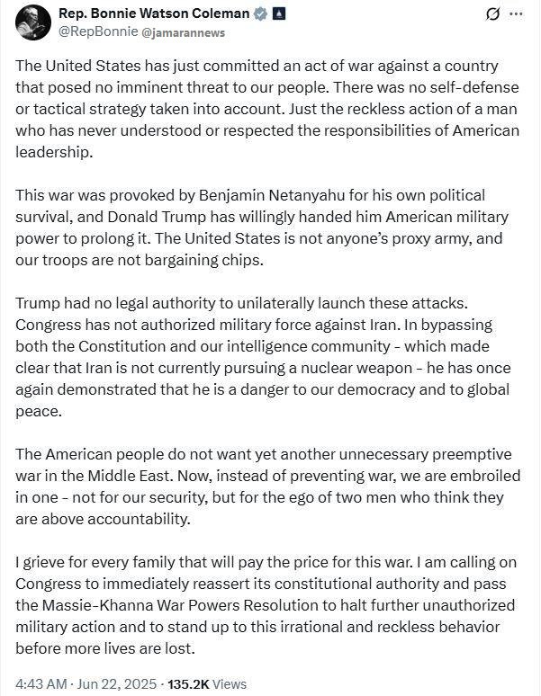 🔸مردم آمریکا خواهان یک جنگ پیشدستانه و بیدلیل دیگر در خاورمیانه نیستند. اکنون، بهجای جلوگیری از جنگ، درگیر آن شدهایم، نه برای امنیتمان، بلکه برای غرور دو مردی که خود را فراتر از پاسخگویی میدانند.