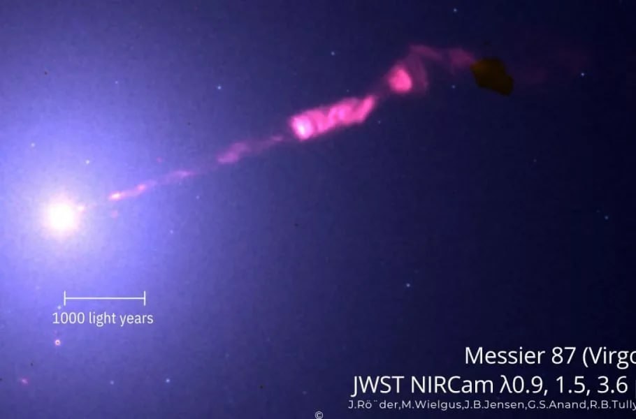 🔸گروهی به سرپرستی «یان رودر» (Jan Röder)، ستارهشناس مؤسسه اخترفیزیک اندلس، با استفاده از تلسکوپ فضایی #جیمز_وب (JWST) موفق شدهاند این تصویر از فوران ذرات را که از سیاهچاله مرکزی M87 به بیرون پرتاب میشود، با دقتی بینظیر ثبت کنند.