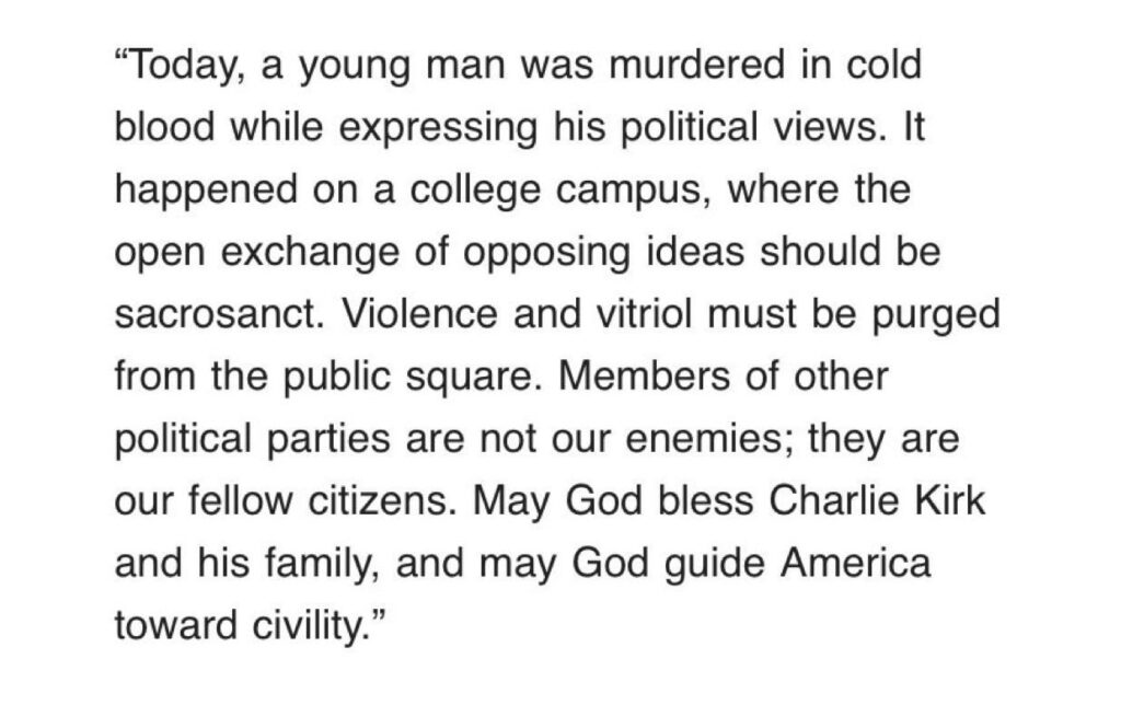 🔸«امروز، یک جوان در حالی که نظرات سیاسی خود را بیان میکرد، به طرز بیرحمانهای به قتل رسید. این اتفاق در یک دانشگاه رخ داد، جایی که تبادل آزادانه ایدههای مخالف باید مقدس باشد. خشونت و کینهتوزی باید از فضای عمومی پاک شود. اعضای احزاب سیاسی دیگر دشمنان ما نیستند؛ آنها هموطنان ما هستند. خداوند چارلی کرک و خانوادهاش را حفظ کند و خداوند آمریکا را به سوی مدنیت هدایت کند.»