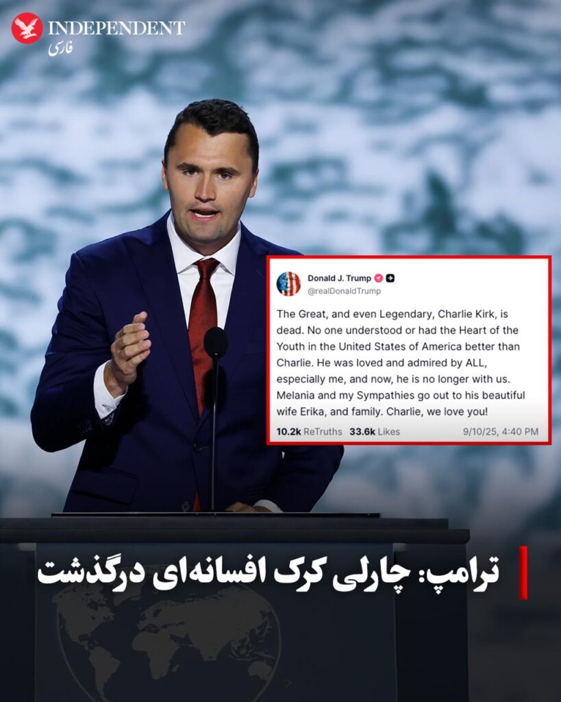 دونالد ترامپ، رئیس‌ جمهوری ایالات متحده، در شبکه اجتماعی تروت سوشال اعلام کرد چارلی کرک «بزرگ و افسانه‌ای» درگذشت