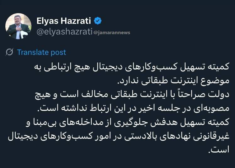 🔸کمیته تسهیل کسب‌وکارهای دیجیتال هیچ ارتباطی به موضوع اینترنت طبقاتی ندارد.