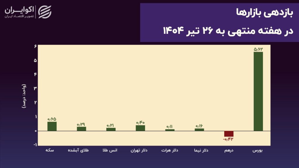 ▫️در بازدهی هفتگی بازارها شاخص کل بورس پیشتاز در رشد بود و بعد از شش هفته سبزپوش شد. اما در مقابل در سمت بازار طلا و ارز شاهد یک نوسان رفت و برگشتی در هفته چهارم تیر ماه بودیم.