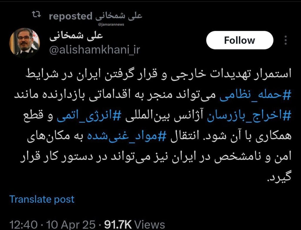 🔸شمخانی مشاور سیاسی رهبر انقلاب پس از صدور قطعنامه ضد ایرانی شورای حکام آژانس بینالمللی انرژی اتمی پیامی که بیش از دو ماه قبل در صفحه شخصی خود در شبکه اجتماعی اکس منتشر کرده بود بدون هیچ توضیحی باز نشر کرد.