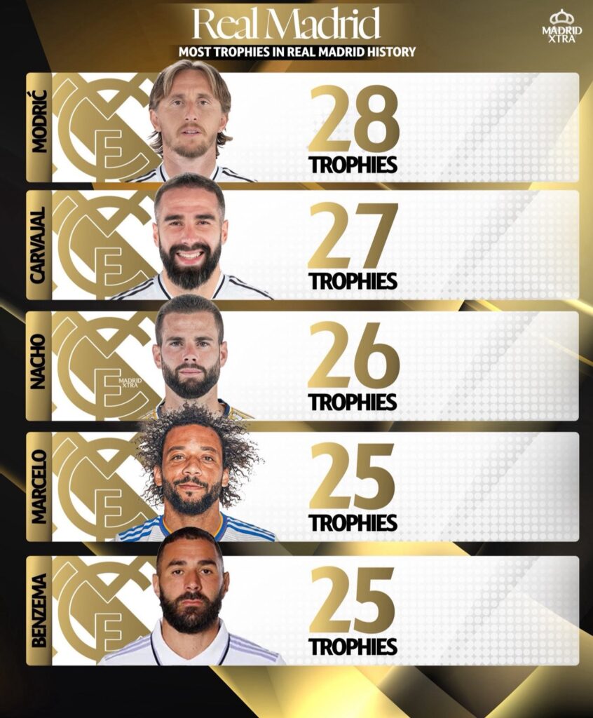 لوکا مودریچ قرار است به عنوان پرافتخارترین بازیکن تاریخ رئال مادرید، این تیم را ترک کند، اما احتمالاً رکورد او در یکی دو سال آینده شکسته خواهد شد