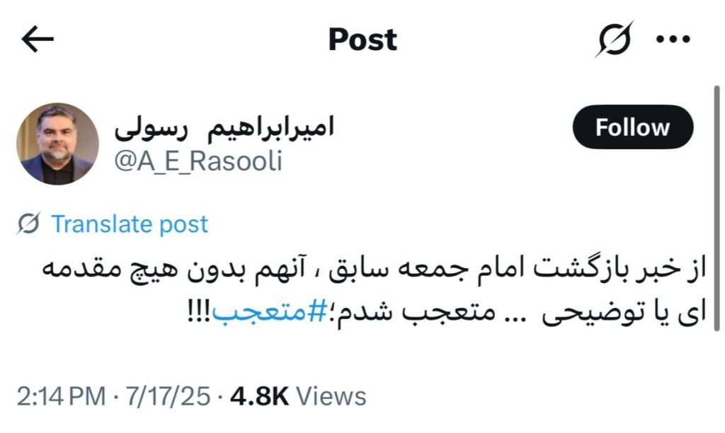 🔸ابراهیم رسولی نوشت: «از خبر بازگشت امام جمعه سابق ، آنهم بدون هیچ مقدمه ای یا توضیحی … متعجب شدم