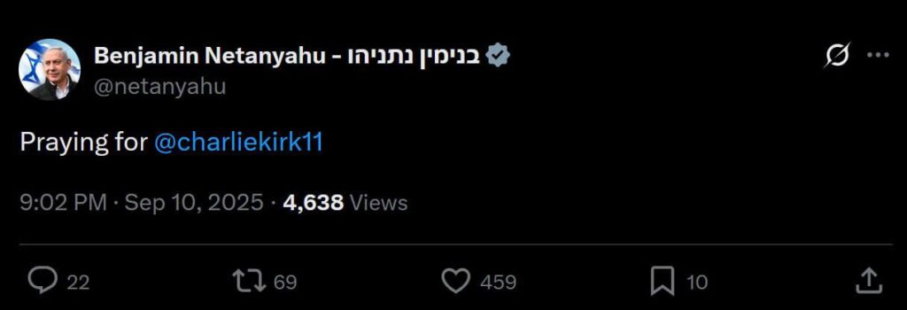 نتانیاهو نخست وزیر رژیم صهیونیستی که به خاطر جنایت جنگی تحت تعقیب است هم اعلام کرده که برای چارلی کرک دعا می کند