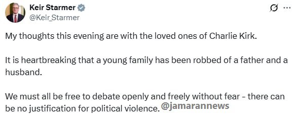 🔸کیئر استارمر نخست وزیر انگلیس در پیام تسلیت خود در پی به هلاکت رسیدن چارلی کرک نوشته است: «همه باید با آزادی و بدون ترس گفت و گو کنیم و حرفمان را بزنیم»