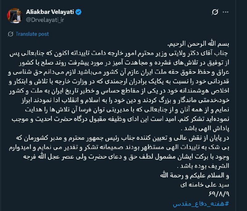 همزمان با سفر پزشکیان به نیویورک و آغاز هفته دفاع مقدس، ولایتی پیام قدردانی رهبری از پیشرفت مذاکرات او با عراق را منتشر کرد