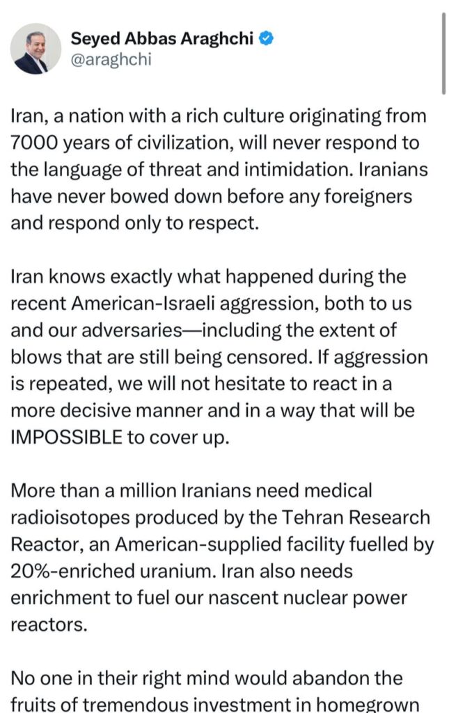 🔸️هشدار ⁧ عراقچی⁩: اگر تجاوز تکرار شود، بدون تردید واکنشی قاطع‌تر نشان خواهیم داد، واکنشی که دیگر امکان پنهان‌ کردنش وجود نخواهد داشت.