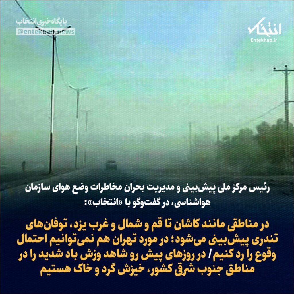🔹 در مناطقی مانند کاشان تا قم و شمال و غرب یزد، توفان‌های تندری پیش‌بینی می‌شود؛ در مورد تهران هم نمی‌توانیم احتمال وقوع را رد کنیم