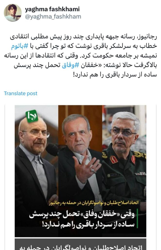 ✅رجانیوز، رسانه جبهه پایداری چند روز پیش مطلبی انتقادی خطاب به سرلشکر باقری نوشت که تو چرا گفتی با باتوم نمیشه بر جامعه حکومت کرد. وقتی که انتقادها از این رسانه بالاگرفت حالا نوشته: «خفقان وفاق تحمل چند پرسش ساده از سردار باقری را هم ندارد!