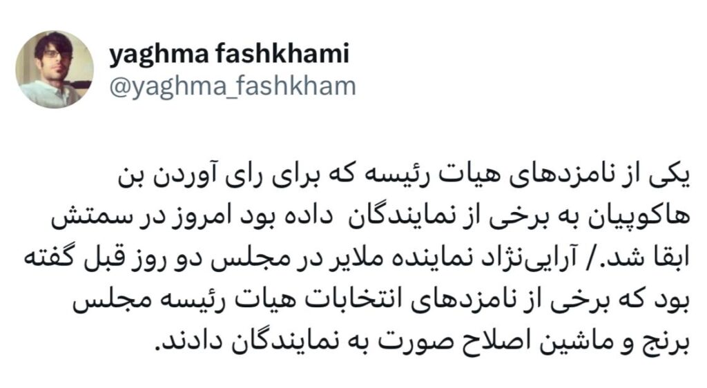 یکی از نامزدهای هیات رئیسه که برای رای آوردن بن هاکوپیان به برخی از نمایندگان داده بود امروز در سمتش ابقا شد./ آرایینژاد نماینده ملایر در مجلس دو روز قبل گفته بود که برخی از نامزدهای انتخابات هیات رئیسه مجلس برنج و ماشین اصلاح صورت به نمایندگان دادند
