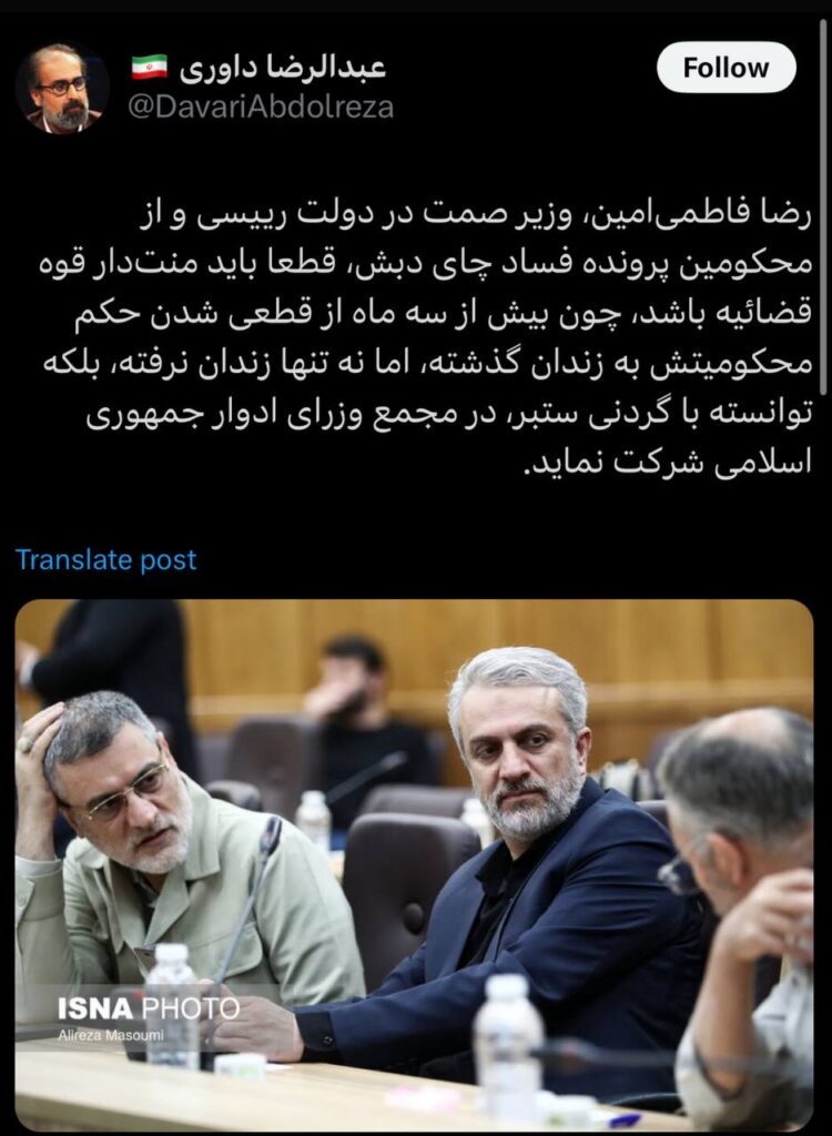 🔸داوری: چرا فاطمی امین با وجود گذشت سه ماه از قطعی شدن حکم هنوز با گردنی ستبر درمجامع عمومی حضور پیدا میکند؟