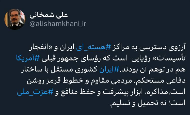 🔴علی شمخانی در واکنش به سخنان ترامپ: مذاکره، ابزار پیشرفت و حفظ منافع و ⁧ عزت ملی⁩ است؛ نه تحمیل و تسلیم
