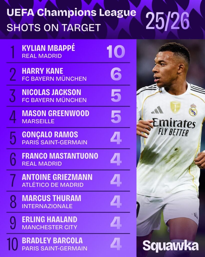 📊 کیلیان امباپه و بیشترین ضربه در چارچوب در لیگ قهرمانان اروپا!