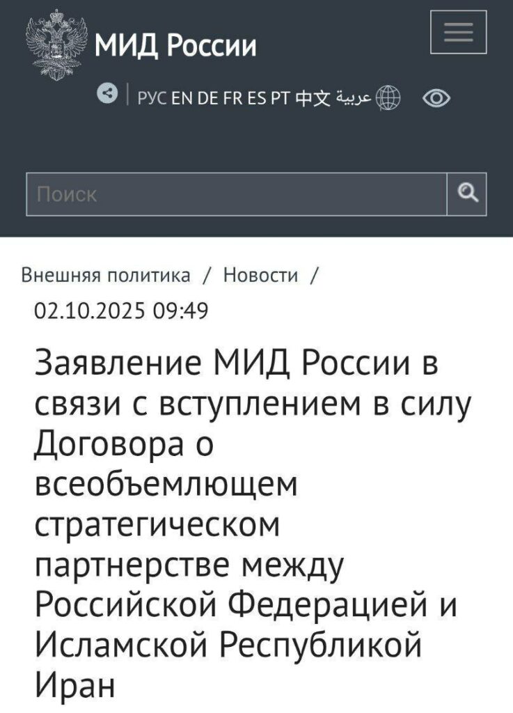 👈وزارت امور خارجه روسیه در بیانیهای اعلام کرد که معاهده مشارکت راهبردی جامع بین فدراسیون روسیه و جمهوری اسلامی ایران که توسط ولادیمیر پوتین و مسعود پزشکیان در تاریخ ۱۷ ژانویه ۲۰۲۵ در مسکو امضا شد، رسماً از امروز اجرایی میشود.