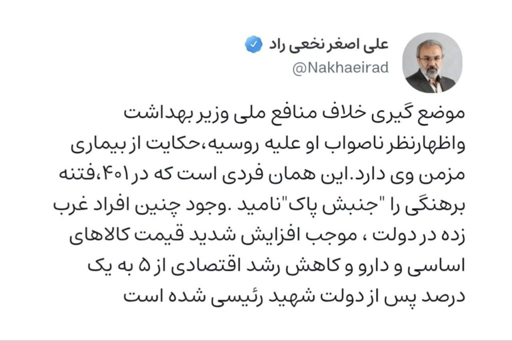 🔸این همان فردی است که در ۴۰۱، فتنه برهنگی را “جنبش پاک” نامید. وجود چنین افراد غرب زده در دولت، موجب افزایش شدید قیمت کالاهای اساسی و دارو و کاهش رشد اقتصادی از ۵ به یک درصد پس از دولت شهید رئیسی شده است.