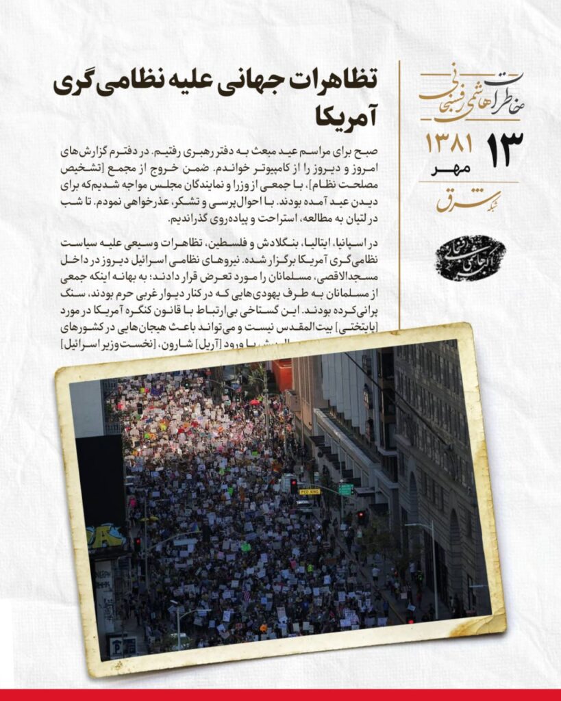 🔹در اسپانیا، ایتالیا، بنگلادش و فلسطین، تظاهرات وسیعى علیه سیاست نظامیگرى آمریکا برگزار شده. نیروهاى نظامى اسرائیل دیروز در داخل مسجدالاقصى، مسلمانان را مورد تعرض قرار دادند؛ به بهانه اینکه جمعى از مسلمانان به طرف یهودىهایى که در کنار دیوار غربى حرم بودند، سنگپرانىکرده بودند. این گستاخى بىارتباط با قانون کنگره آمریکا در مورد [پایتختی] بیتالمقدس نیست و مىتواند باعث هیجانهایى در کشورهاى اسلامى شود.