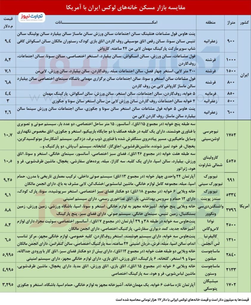 🔸بررسیها نشان میدهد که امکانات خانه های لوکس در آمریکا به مراتب بسیار بیشتر از ایران است و حتی سطح رفاهی واحدهای یک میلیون دلاری در ایالات متحده از واحدهای لوکس ۱۰ میلیون دلاری در تهران فراتر میرود./ تجارتنیوز