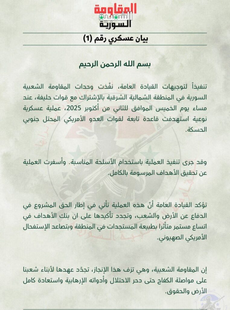 🔸مقاومت مردمی سوریه در منطقه شمال شرقی اعلام کرده که با همکاری نیروهای متحد شامگاه روز جمعه برابر با دوم اکتبر ۲۰۲۵ یک عملیات ویژه نظامی که طی آن پایگاه وابسته به نیروهای دشمن اشغالگر آمریکایی در جنوب حسکه هدف قرار گرفت را انجام داده است.