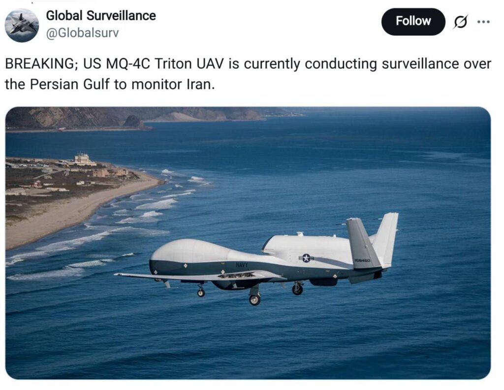 🔸پهپاد MQ-4C Triton ایالات متحده در حال حاضر در حال نظارت بر خلیج فارس به منظور رصد ایران است.