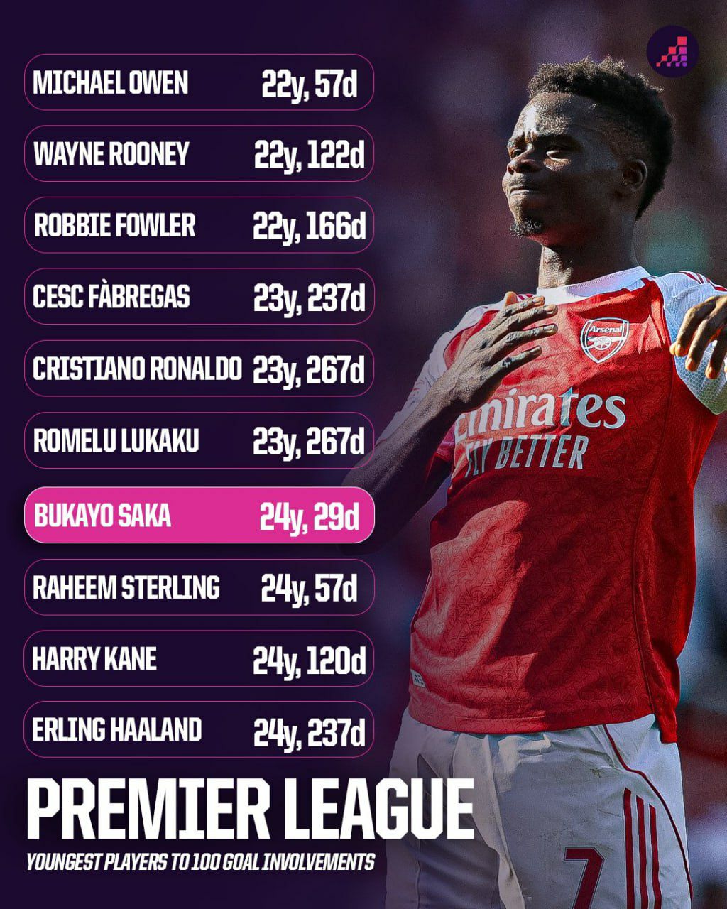 ساکا با 24 سال و 29 روز، هفتمین بازیکن جوان تاریخ لیگ برتر است که به رکورد 100 تاثیرگذاری مستقیم روی گلها میرسد. ساکا در 200 بازی در لیگ برتر، آمار 55 گل و 45 پاس گل را ثبت کردهاست @Tarafdari