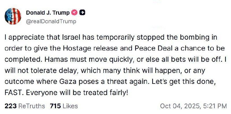 🔹قدردانم که اسرائیل موقتاً حملات را متوقف کرده تا فرصت آزادی گروگانها و تکمیل توافق صلح فراهم شود. حماس باید سریع عمل کند، تأخیر قابل قبول نیست. 🔹اگر غزه دوباره تهدیدی باشد، همهچیز تغییر خواهد کرد. بیایید این کار را سریع تمام کنیم؛ همه منصفانه برخورد خواهند شد. امتداد