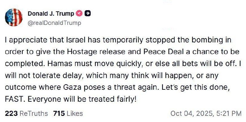 🔸قدردانم که اسرائیل موقتاً حملات را متوقف کرده تا فرصت آزادی گروگانها و تکمیل توافق صلح فراهم شود. حماس باید سریع عمل کند، تأخیر قابل قبول نیست. 🔸اگر غزه دوباره تهدیدی باشد، همهچیز تغییر خواهد کرد. بیایید این کار را سریع تمام کنیم؛ همه منصفانه برخورد خواهند شد. بین_الملل