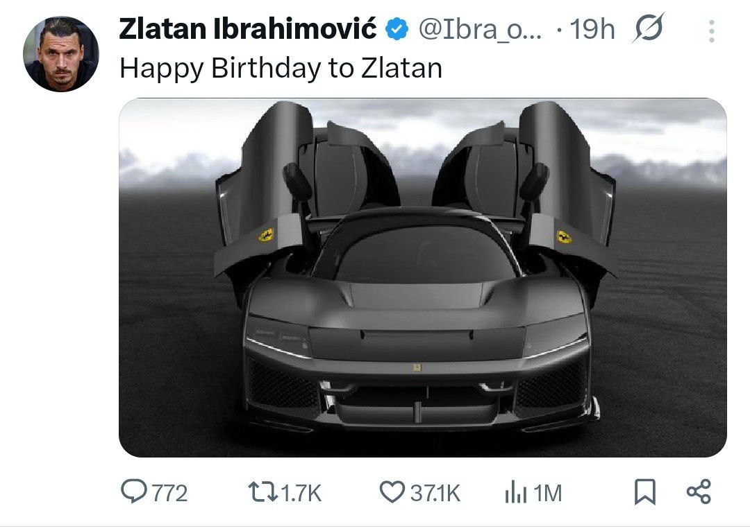 ستاره سالهای نهچندان دور فوتبال، سنت همیشگی خود را ادامه داد و برای تولدش، یک فراری F80 به قیمت ۳.۵ میلیون یورو به کلکسیونش اضافه کرد که تنها ۷۹۹ نسخه در جهان ساختهشده است این سوئدی افسانهای پیشتر مدلهایی مانند SF90 و Daytona SP3 را نیز در گاراژ خود