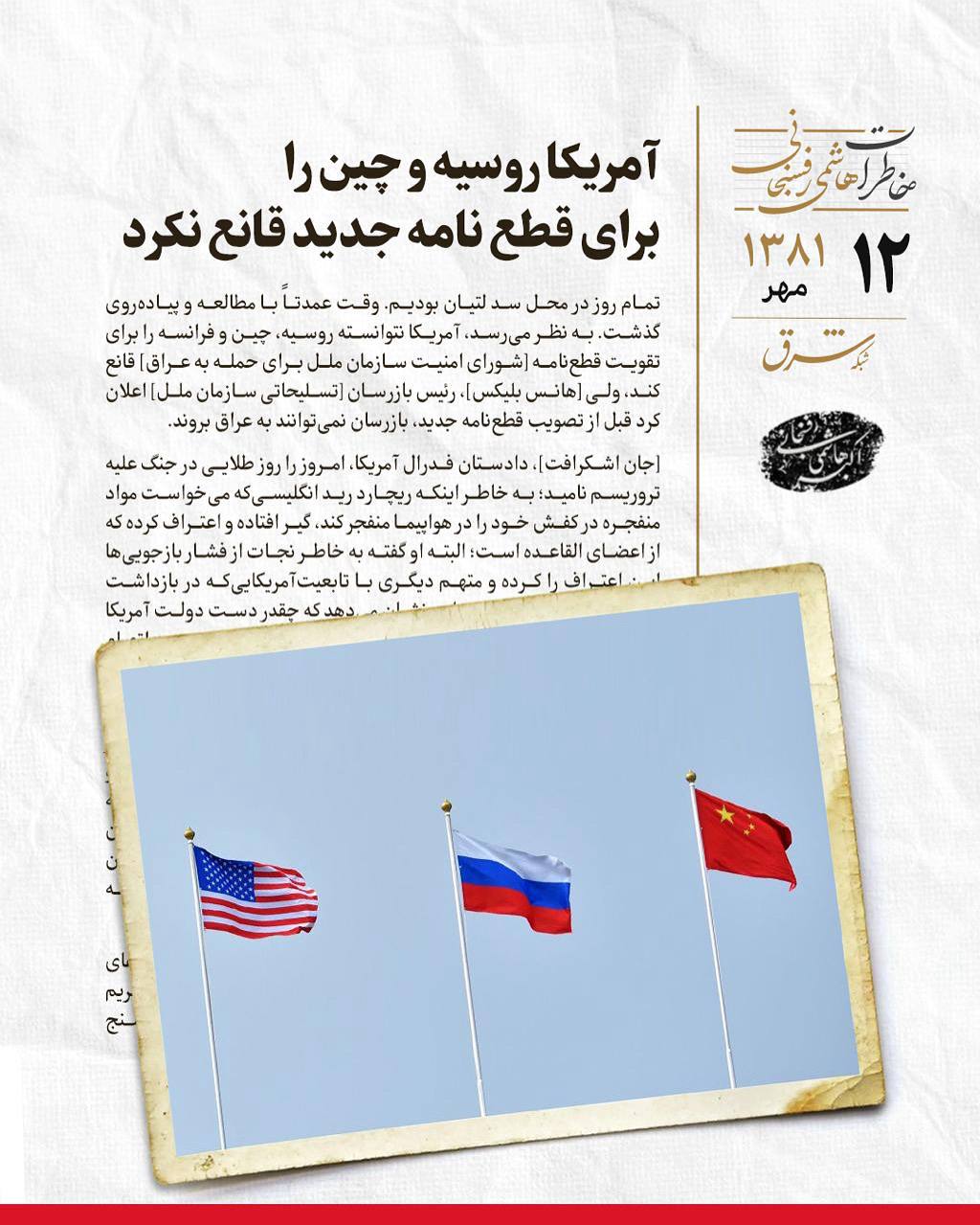 🔺آمریکا روسیه و چین را برای قطعنامه جدید قانع نکرد 🔹تمام روز در محل سد لتیان بودیم. وقت عمدتاً با مطالعه و پیادهروی گذشت. به نظر مىرسد، آمریکا نتوانسته روسیه، چین و فرانسه را براى تقویت قطعنامه [شورای امنیت سازمان ملل برای حمله به عراق] قانع کند، ولى [هانس