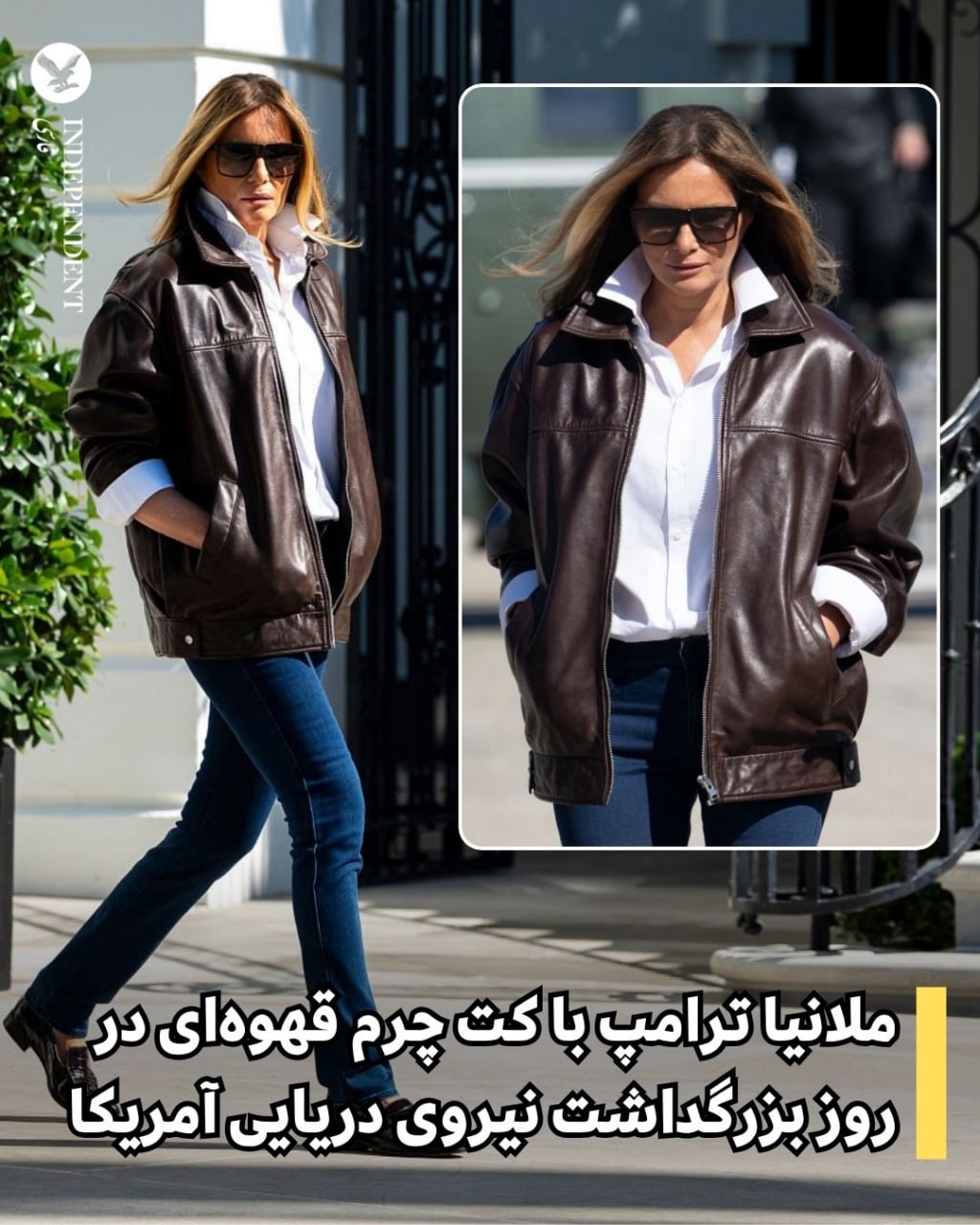 او در این مراسم کت چرم قهوهای تیره، مدل «تیا، خلبانی سایز بزرگ» (Theia) از نشان تجاری «لامارک» (LaMarque) بر تن داشت؛ لباسی خوشدوخت که با شلوار جین جلوهای کلاسیک و در عین حال مدرن به سبک او بخشیده بود. @IndyPersian