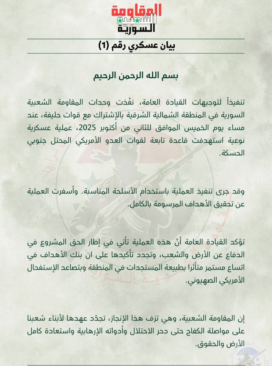 🔸مقاومت مردمی سوریه در منطقه شمال شرقی اعلام کرده که با همکاری نیروهای متحد شامگاه روز جمعه برابر با دوم اکتبر ۲۰۲۵ یک عملیات ویژه نظامی که طی آن پایگاه وابسته به نیروهای دشمن اشغالگر آمریکایی در جنوب حسکه هدف قرار گرفت را انجام داده است. 🔸در این بیانیه