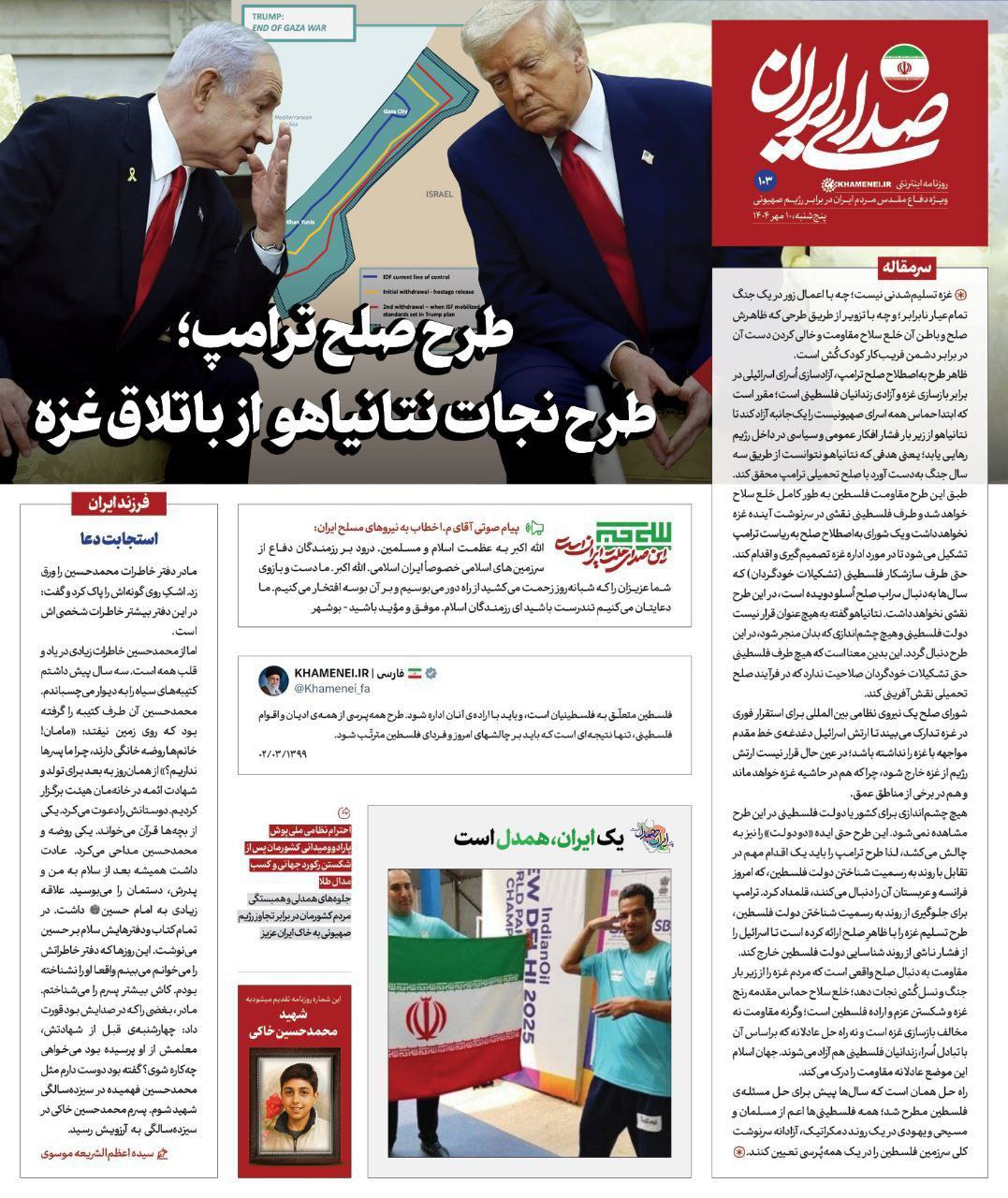 🔸رسانه دفتر رهبر انقلاب در نخستین واکنش به طرح ترامپ برای پایان جنگ غزه، این طرح را اقدامی برای نجات بنیامین نتانیاهو از فشار داخلی توصیف کرد. در این تحلیل آمده است: آنچه با عنوان بازسازی غزه و آزادی اسرا مطرح شده، در واقع طرحی برای خلع سلاح کامل