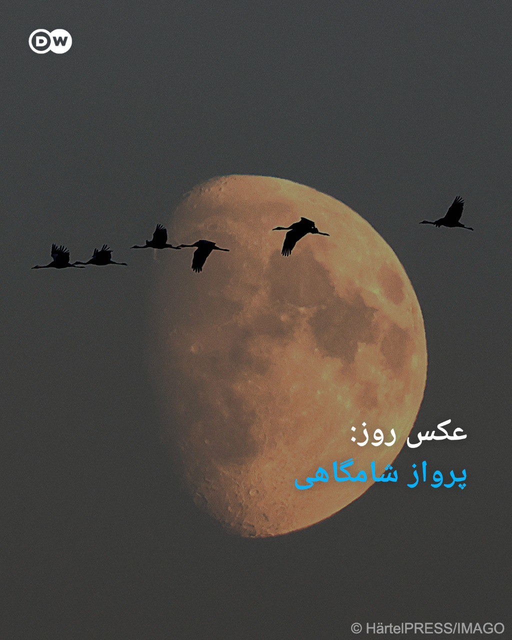 دستهای منظم از درناها که هنگام غروب آفتاب یک روز پاییزی در آسمان منطقهای در شمال آلمان به پرواز درآمدهاند. این پرندگان زیبا در ساعات حوالی غروب به سمت محل اقامت شبانهشان کوچ میکنند. این پرندهها در زمان پرواز، گردن و پاهای خود را کشیده نگه میدارند. گلههای درناها