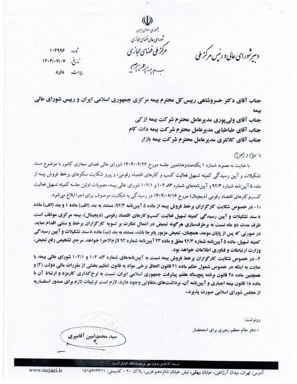 🔹کمیته تسهیل شورای عالی فضای مجازی در ابلاغیهای به شکایت استارتاپهای بیمهای علیه بیمه مرکزی رسیدگی کرد و بیمه مرکزی موظف است ظرف دو ماه هرگونه تبعیض میان شبکه سنتی فروش و کارگزاران آنلاین را برطرف کند؛ در غیر این صورت، برخی از آییننامههای محدودکننده به حالت تعلیق درمیآیند.