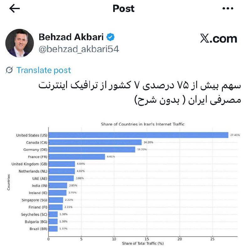 📍۷ کشور صاحب بیش از ۷۵ درصد اینترنت مصرفی ایران هستند 🔹معاون وزیر ارتباطات و مدیرعامل شرکت ارتباطات زیرساخت اعلام کرده است که بیش از ۷۵ درصد ترافیک اینترنت مصرفی ایران مربوط به ۷ کشور خارجی است. 🔹 در همین زمینه، بهزاد اکبری با انتشار نموداری در ایکس نوشت: