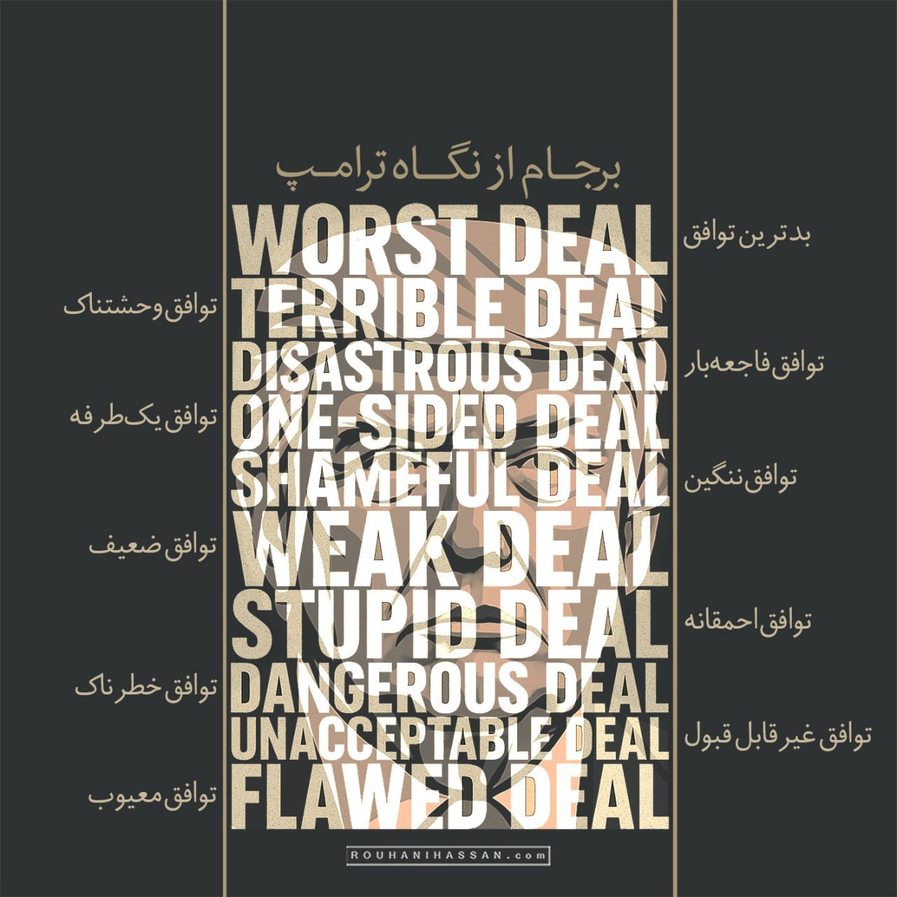 پوستری که توییتر حسن روحانی منتشر کرد 🔸برجام از نظر ترامپ توافق ضعیف، یک طرفه، فاجعهبار، ننگین و… بود نکته عجیب در این است که سالها در داخل همین کشور عدهای برجام را با همین صفات به زبان آوردند و آن را برای ایران ننگین نامیدند؛ این هم صدایی