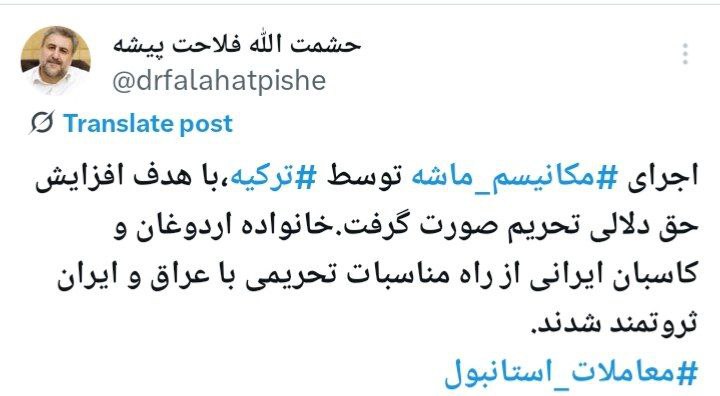 فلاحت پیشه در واکنش به اجرای مکانیسم ماشه توسط ترکیه نوشت : 🔸اجرای مکانیسم ماشه توسط ترکیه،با هدف افزايش حق دلالی تحریم صورت گرفت.خانواده اردوغان و کاسبان ایرانی از راه مناسبات تحریمی با عراق و ایران ثروتمند شدند. بین_الملل اقتصاد ❇️@baamdadeno