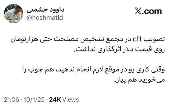 🔸تصویب cft در مجمع تشخیص مصلحت حتی هزارتومان روی قیمت دلار اثرگذاری نداشت. وقتی کاری رو در موقع لازم انجام ندهید، هم چوب را میخورید هم پیاز. سیاست ❇️@baamdadeno