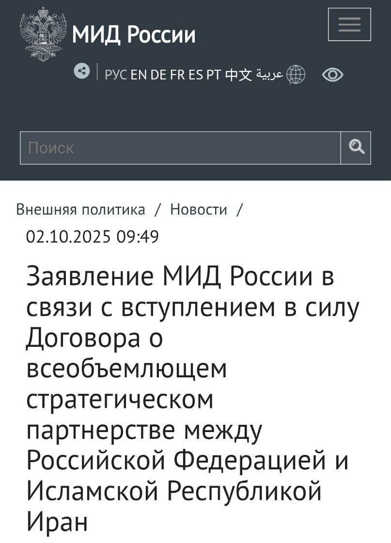 👈وزارت امور خارجه روسیه در بیانیهای اعلام کرد که معاهده مشارکت راهبردی جامع بین فدراسیون روسیه و جمهوری اسلامی ایران که توسط ولادیمیر پوتین و مسعود پزشکیان در تاریخ ۱۷ ژانویه ۲۰۲۵ در مسکو امضا شد، رسماً از امروز اجرایی میشود. 🔻 مفاد اصلی توافق ایران و روسیه؛ 1️⃣