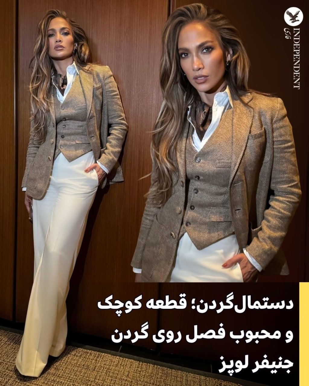 یکی از جزئیات ظریف در ظاهر لوپز، دستمالگردن قهوهای بود که از زیر بلوز سفید با دکمههای باز دیده میشد. این قطعه کوچک، یکی از پرکاربردترین عناصر مد سال است و در اغلب مجموعههای طراحان بزرگ دنیا ظاهر شد. دستمال سر کوچک یا باندانا امسال جایگاه تازهای در مد
