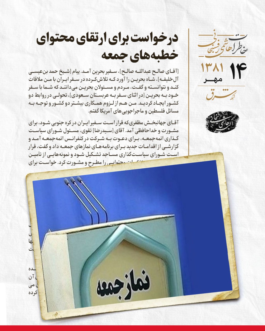 🔺درخواست برای ارتقای محتوای خطبههای نماز جمعه 🔹آقاى [سیدرضا] تقوى، مسئول شوراى سیاستگذارى ائمهجمعه، براى دعوت به شرکت در کنفرانس ائمهجمعه آمد و گزارشى از اقدامات جدید براى برنامههاى نمازهاى جمعه داد و گفت، قرار است شورای سیاستگذارى مساجد تشکیل شود و نمونههایى از تأمین منزل و ماشین و