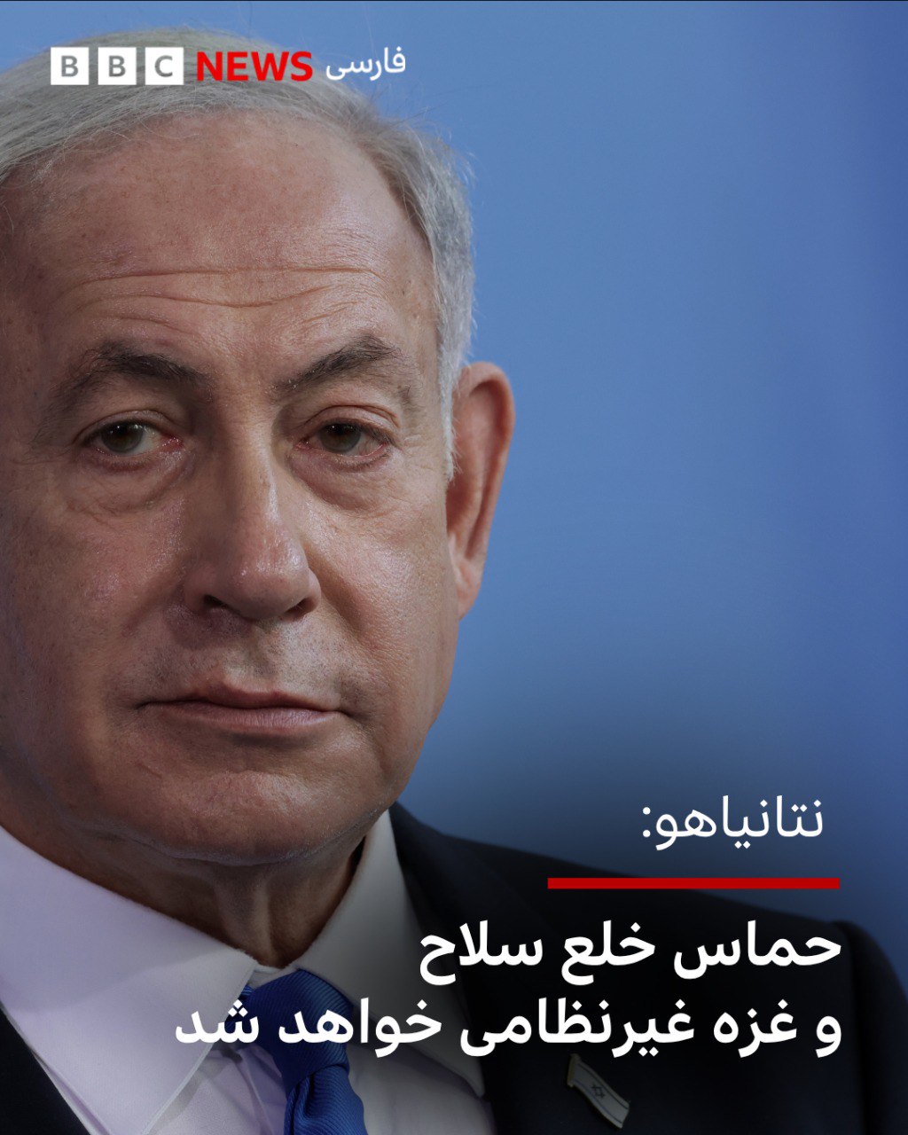 او در ادامه میگوید که این گروه خلع سلاح خواهد شد. آقای نتانیاهو گفته است: «در مرحله دوم، حماس خلع سلاح و غزه غیرنظامی خواهد شد – یا به روش آسان یا به روش دشوار، اما این امر محقق خواهد شد.» 📷Getty Images @BBCPersian